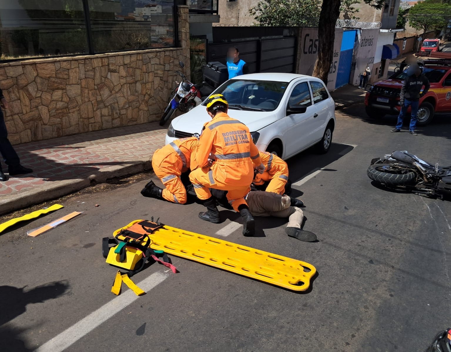 Com o impacto da batida, o motociclista, um homem, foi lançado ao solo e sofreu fratura exposta na perna. Ele recebeu os primeiros socorros ainda no local, em um atendimento rápido e preciso realizado pelos bombeiros, com o apoio do SAMU.