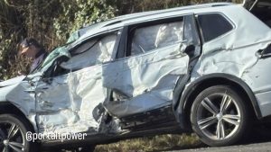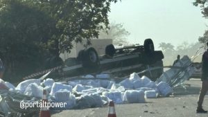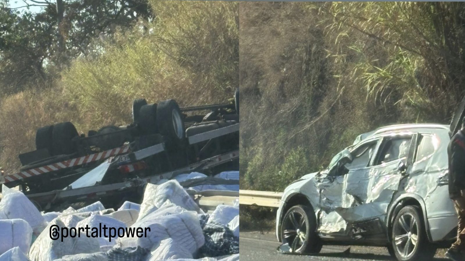 Conforme apurado, o acidente sentido Areado, envolveu três veículos, sendo um caminhão carregado com panos um Fiat Uno e um Volkswagen Tiguan. O caminhão tombou e ficou com as rodas para cima, espalhando a carga pela pista.
