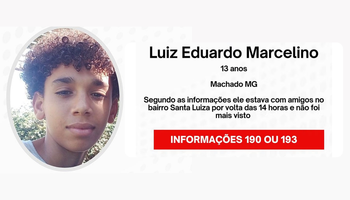 O domingo que prometia ser de lazer terminou com angústia para a família de Luiz Eduardo Marcelino, de 13 anos, em Machado. O adolescente desapareceu nas proximidades do rio Machado, no bairro Santa Luzia, enquanto participava de um churrasco com amigos.