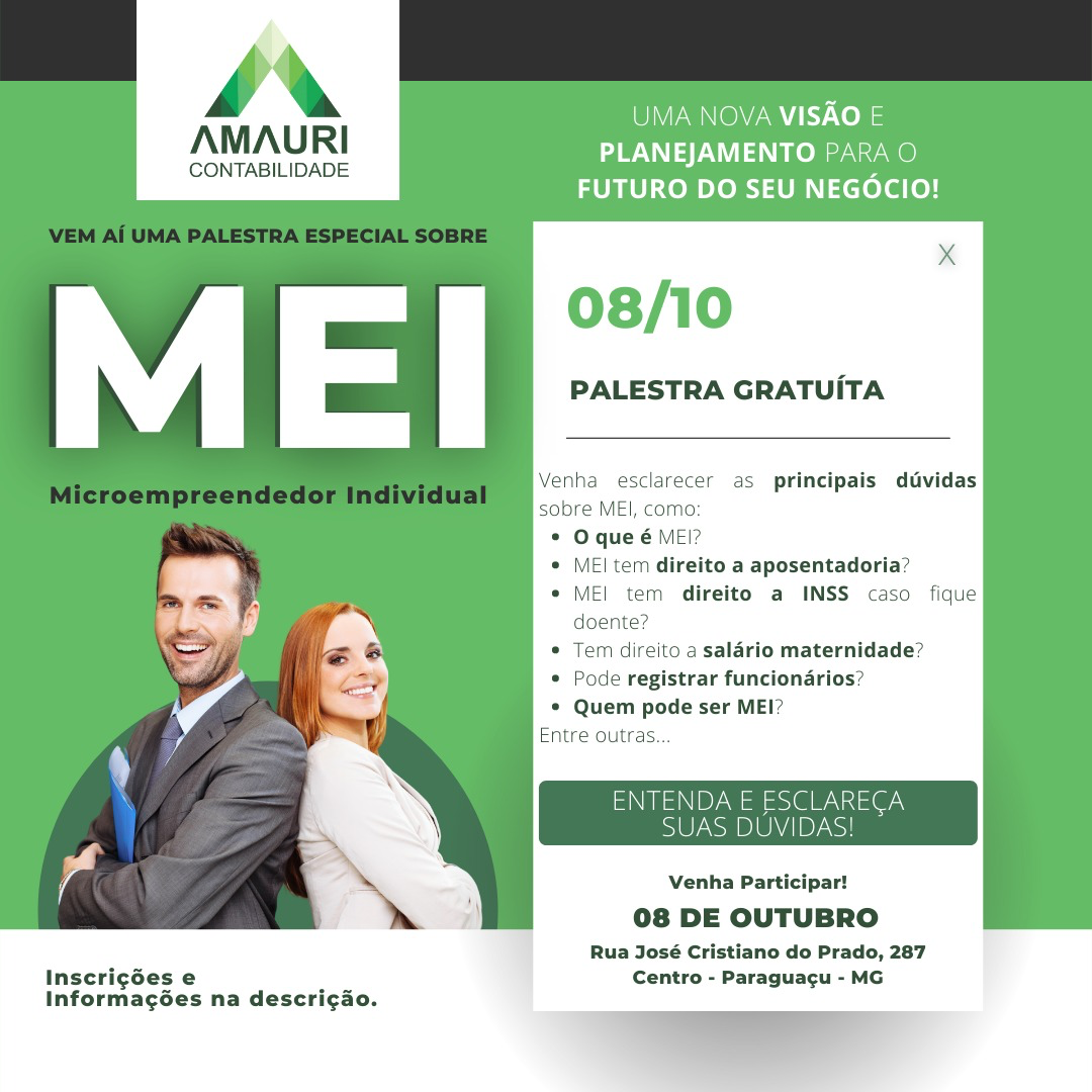 No dia 08 de outubro às 19h30 o escritório de Contabilidade AMAURI, realizará o curso “MEI de Sucesso” em sua sede na Rua José Cristiano do Prado, 287, no centro de Paraguaçu (MG).
