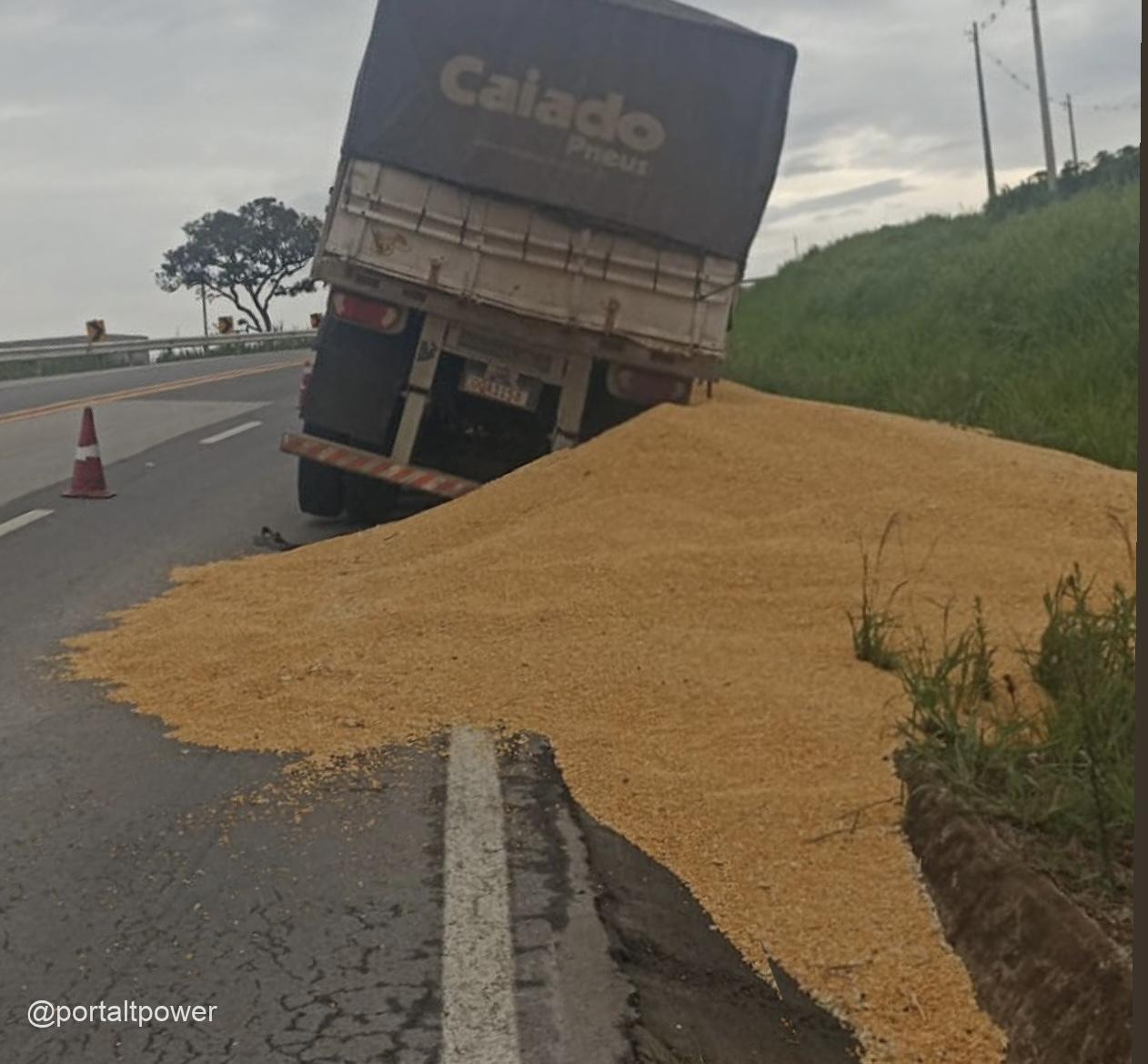 Com o desvio, o caminhão saiu da pista e parte de sua carga de milho acabou se espalhando sobre uma das faixas e na lateral da via, dificultando o tráfego de veículos no trecho.