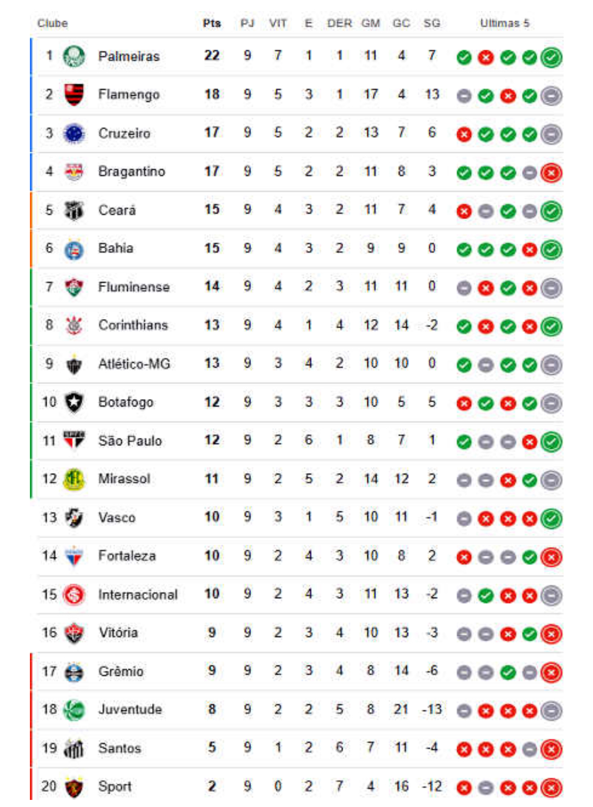 A 9ª rodada do Campeonato Brasileiro movimentou o domingo, 18 de maio, com clássicos regionais e confrontos diretos entre os principais clubes da elite nacional. O destaque ficou para o Palmeiras, que venceu o Red Bull Bragantino por 2 a 1 fora de casa e assumiu a liderança isolada da competição com 22 pontos.