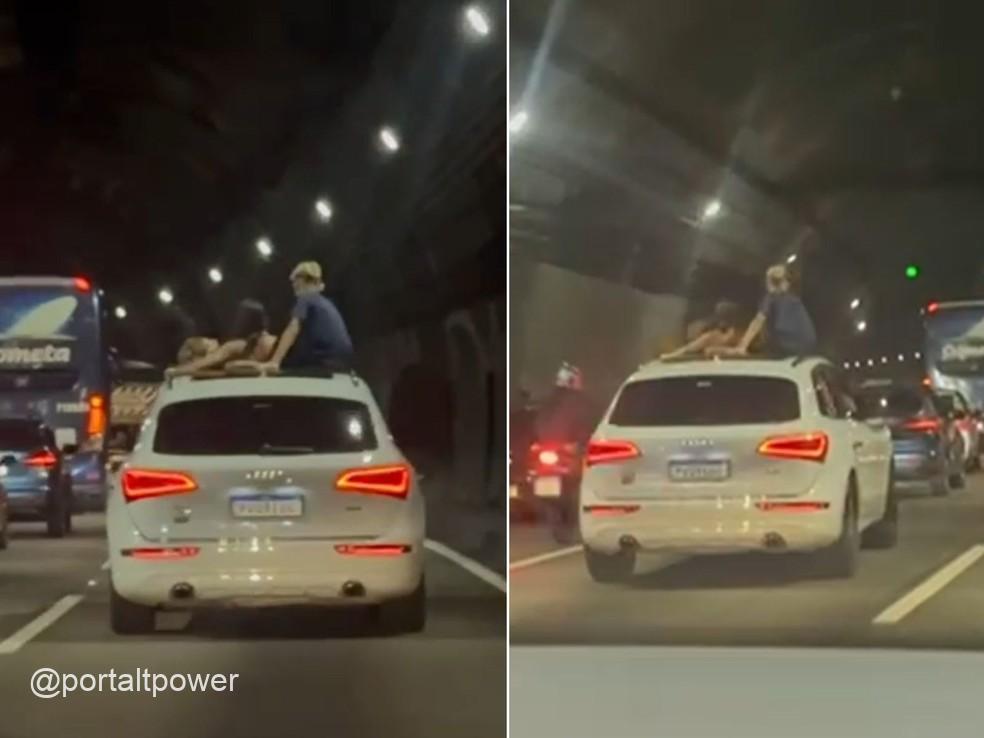Ainda de acordo com o relato, outras pessoas também apareciam para fora do carro. Ao menos duas crianças estavam no teto solar, além de um terceiro ocupante, que seria um adulto ou adoIescente. O casal afirmou que os ocupantes permaneceram nessa condição em outros trechos da rodovia, inclusive fora do túnel.