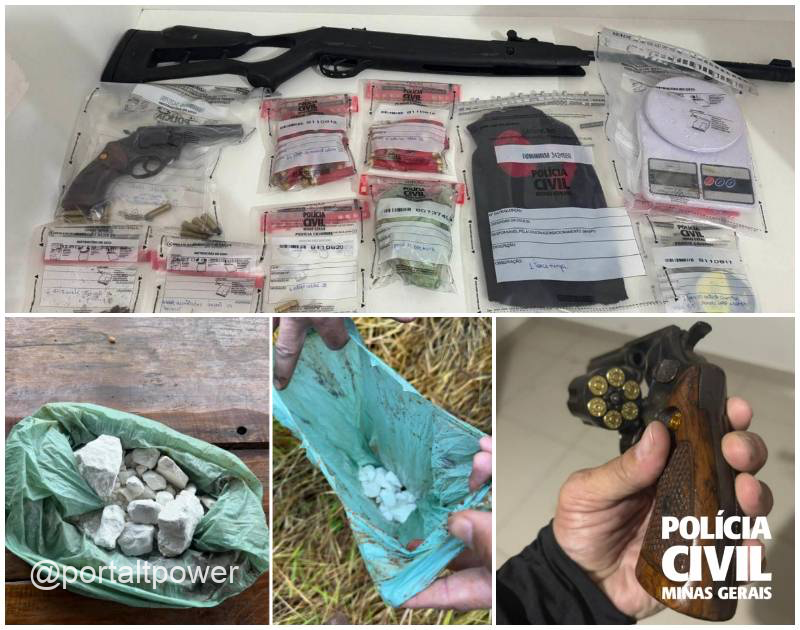 Durante o cumprimento das ordens judiciais, foram realizadas buscas em três endereços ligados ao investigado, sendo um na zona rural e dois na área urbana do município. No local, os policiais apreenderam um revólver calibre 38 com sete munições, 15 munições calibre 32, 21 estojos do mesmo calibre, uma espingarda de pressão calibre 5.5, frascos de chumbinho, cerca de 250 gramas de cocaína, uma balança de precisão, uma touca balaclava, três celulares e um armário com selo de patrimônio público.