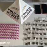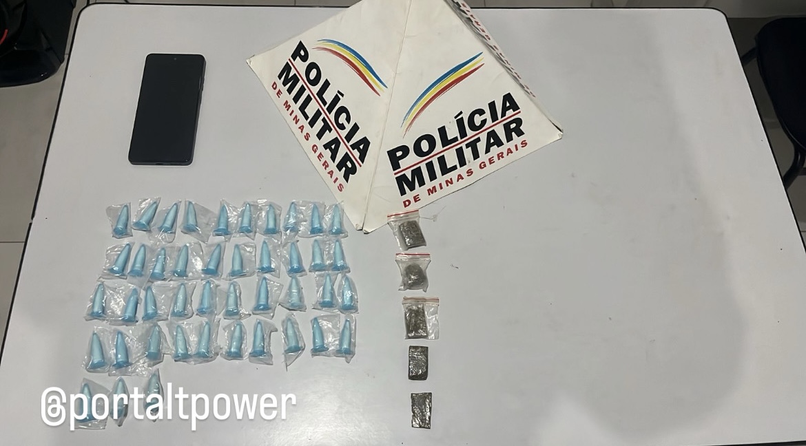 O homem estava com uma sacola verde contendo 43 pinos de substância análoga à cocaína, 5 buchas de substância semelhante à maconha e 1 aparelho celular.