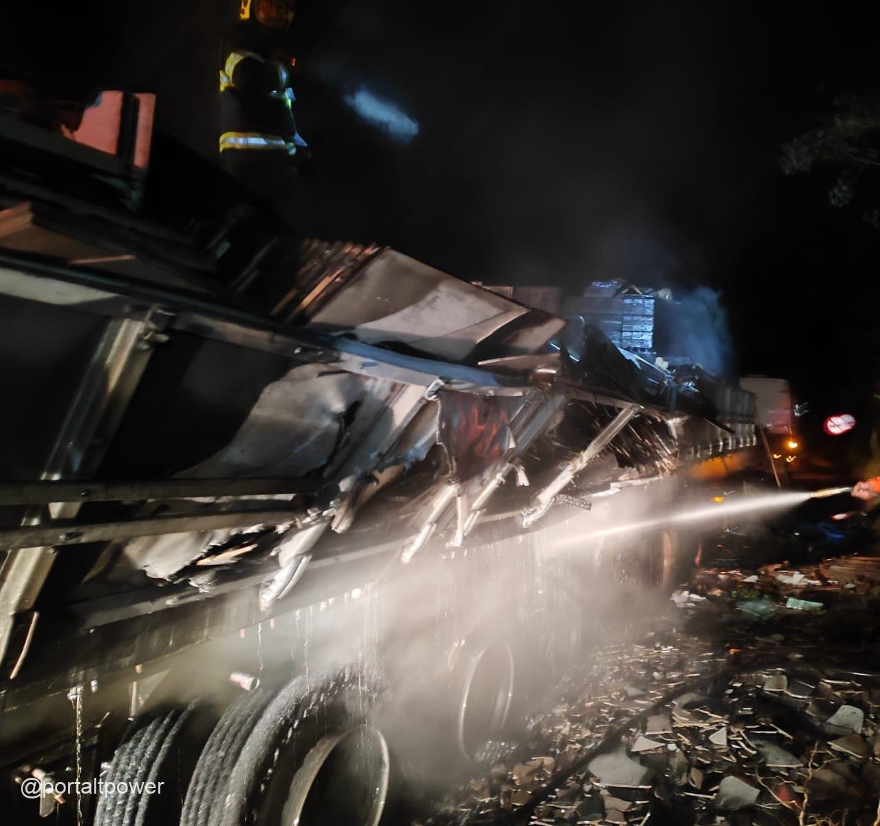 Um incêndio atingiu uma carreta na madrugada desta quinta-feira (15), por volta de 0h20, na MGC-491, nas proximidades do município de Muzambinho. O veículo transportava uma carga de revestimentos para construção.