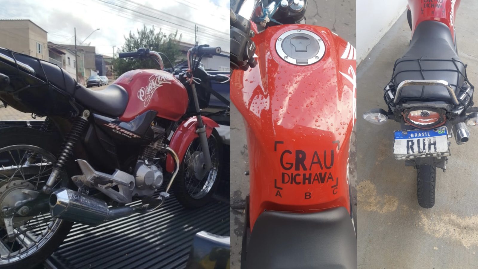 Conforme apurado, a motocicleta possui um adesivo com a expressão “grau dichava”, termo popularmente associado à prática de empinar moto e realizar manobras perigosas, usadas como forma de ostentação ou desafio no trânsito.