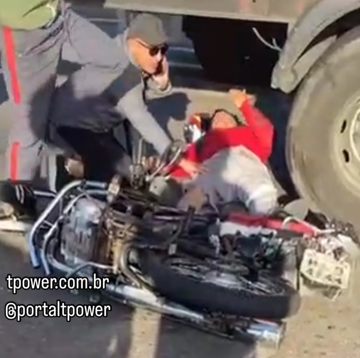 O acidente envolveu um motociclista de 24 anos, que foi encontrado deitado sob o caminhão, consciente e orientado, mas com uma laceração na perna direita. A equipe dos Bombeiros controlou a cena, prestou os primeiros socorros, imobilizou a perna lesionada e monitorou os sinais vitais da vítima.
