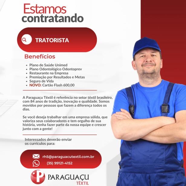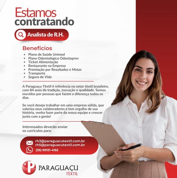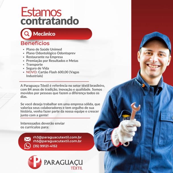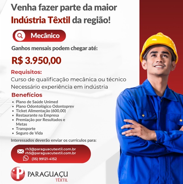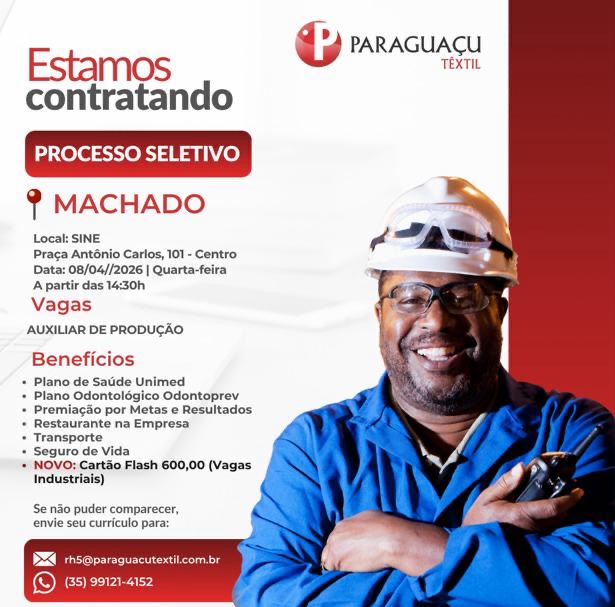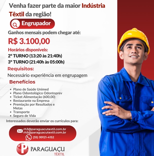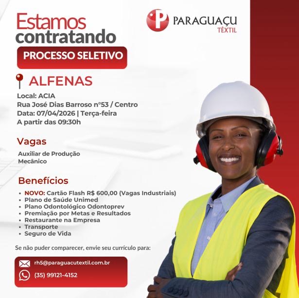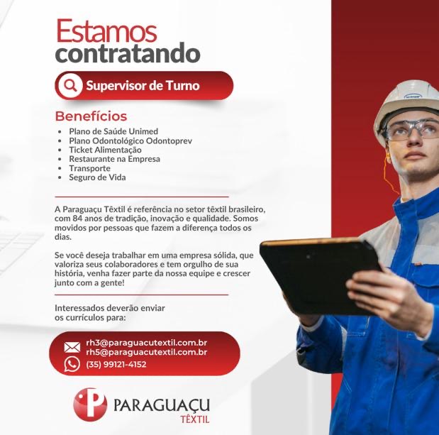 A Paraguaçu Têxtil, está com oportunidades de emprego abertas para diferentes funções em três turnos, com processos seletivos nas cidades de Alfenas, Elói Mendes, Machado e Paraguaçu.