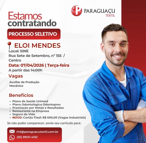 Elói Mendes: o processo seletivo será realizado no SINE, na Rua Sete de Setembro, nº 155, Centro, na terça-feira (07/04/2026), a partir das 14h.
