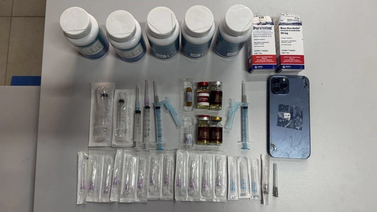 Entre os itens apreendidos estavam masteron, durateston, enantato de testosterona, enanteston e deca-durabolin, além de seringas descartáveis e outros materiais que reforçam as suspeitas de comércio ilegal.