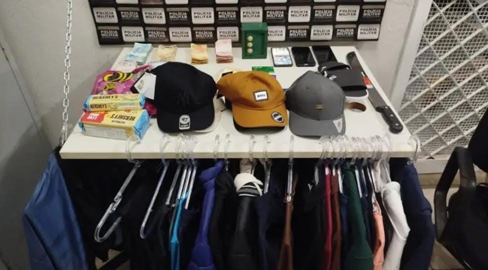Dentro do carro, a PM encontrou roupas, bonés, pares de chinelos, chocolates, celulares e a quantia de R$ 11.206,60, além de um facão usado por um dos suspeitos. As vítimas das lojas arrombadas em Cambuquira reconheceram os produtos recuperados.