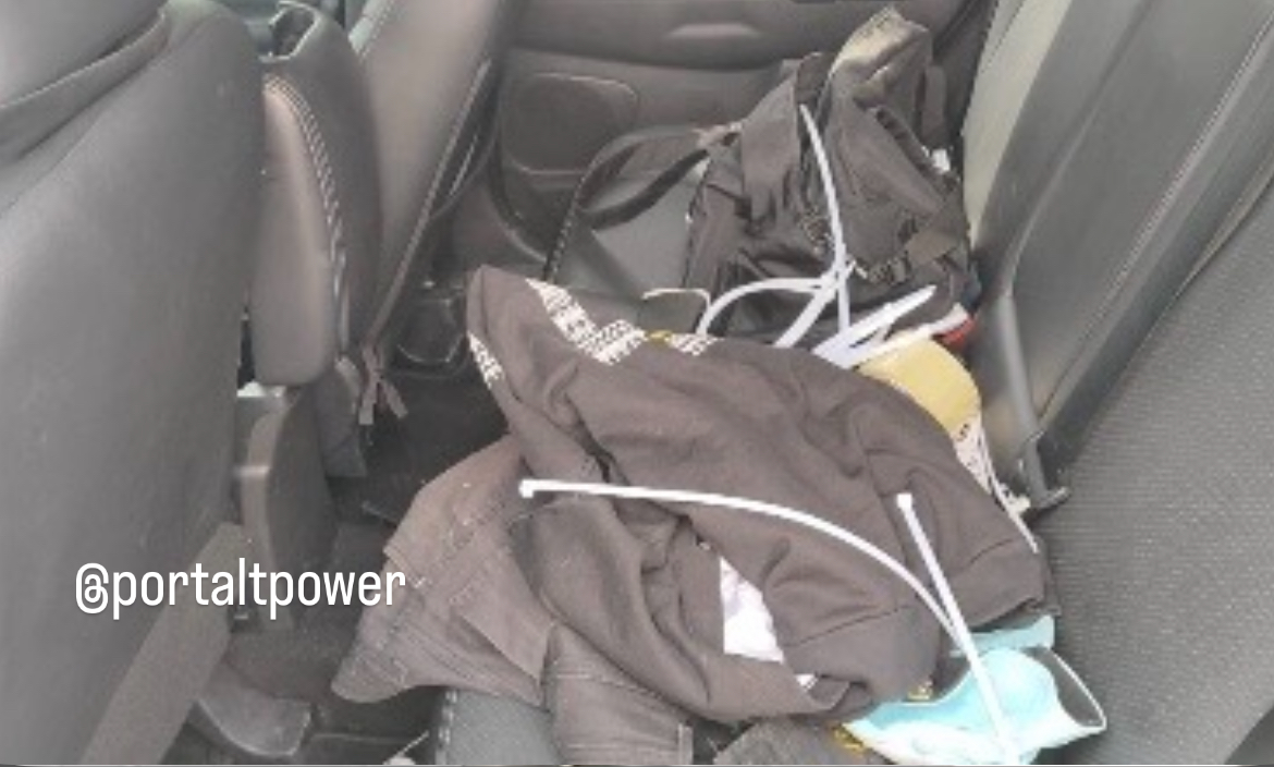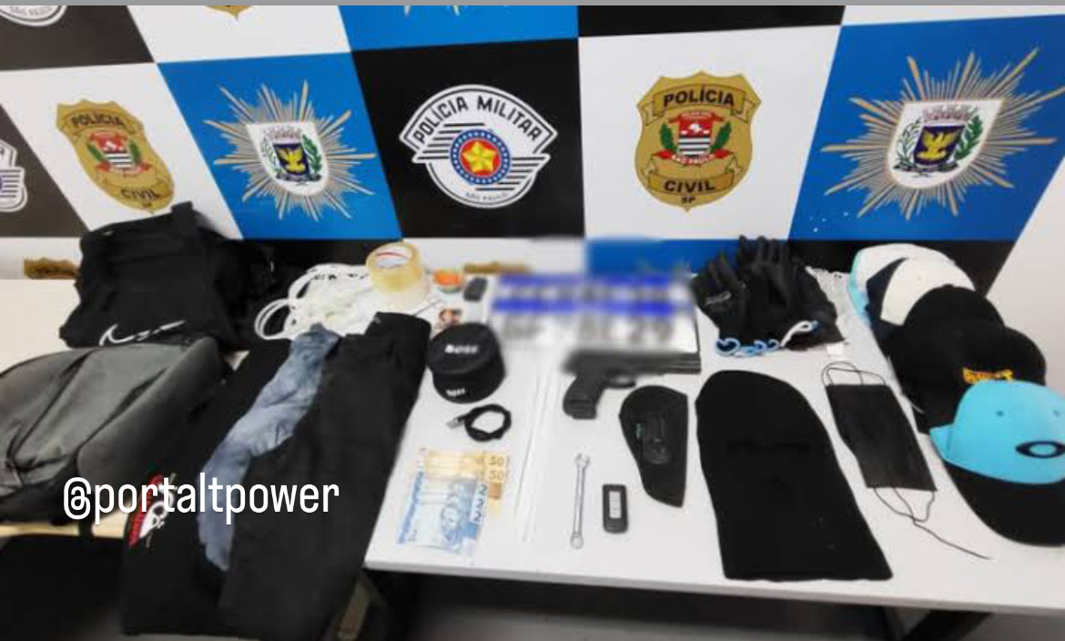 Durante o patrulhamento, um dos suspeitos foi localizado e abordado. Com ele, os policiais encontraram um simulacro de pistola e a chave do veículo abandonado. No interior do carro foram localizados balaclavas, trocas de roupa, cintas plásticas em formato de algemas, luvas, fitas adesivas, um aparelho bloqueador de sinais e um par de placas sem registro.